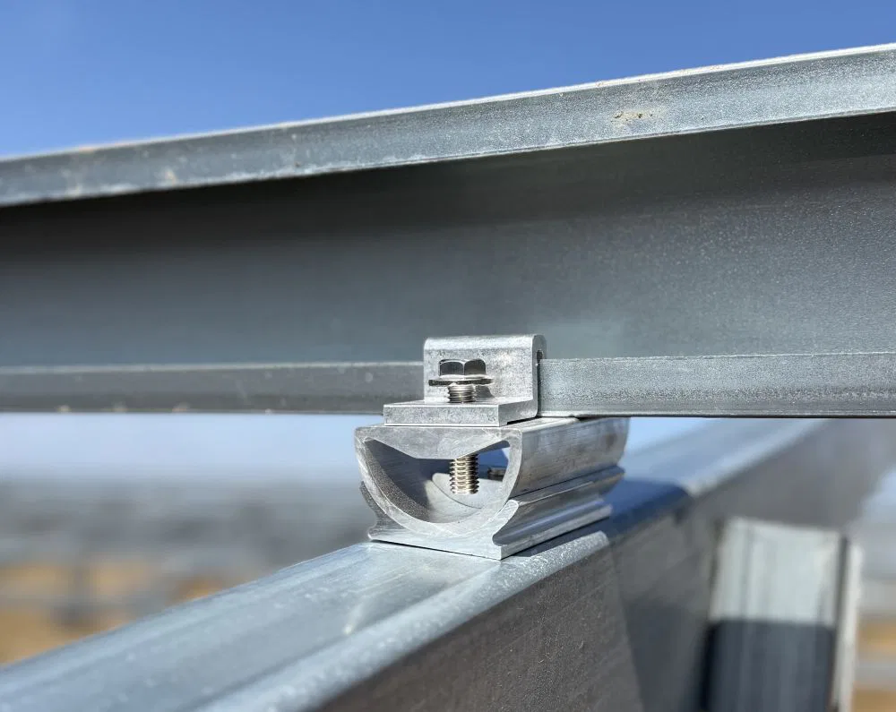 The new compensation clamp from T.Werk, THEMIS, aligns the horizontal rail with the terrain and the support point. This allows terrain unevenness of up to 30 degrees to be compensated for steplessly and without interrupting the tables.