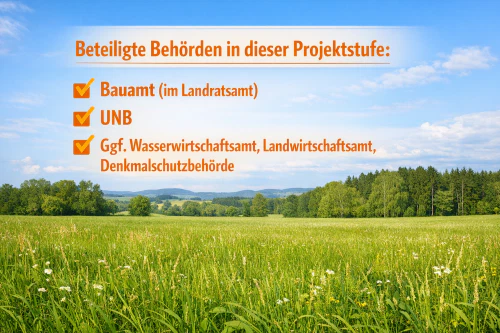 Jetzt werden die wichtigsten Rahmenbedingungen mit den zuständigen Stellen geklärt, bevor Zeit und Budget in die Detailplanung fließen. Dazu gehören Gespräche mit Landratsamt, Bauamt und Unterer Naturschutzbehörde sowie die frühzeitige Netzanfrage beim Netzbetreiber, um Genehmigungsweg, Prüfbedarf und Anschlussmöglichkeiten abzusichern. So lassen sich spätere Verzögerungen oft deutlich reduzieren.