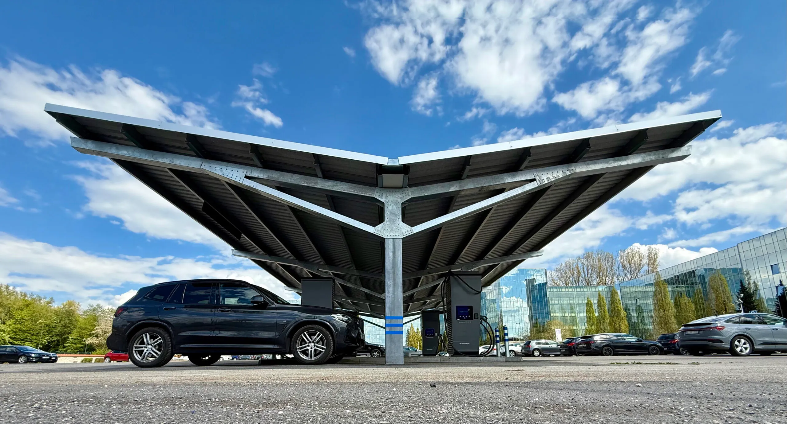 - Schutz der Fahrzeuge vor Witterungseinflüssen wie UV-Licht, Hagel und Starkregen, kombiniert mit der Stromproduktion